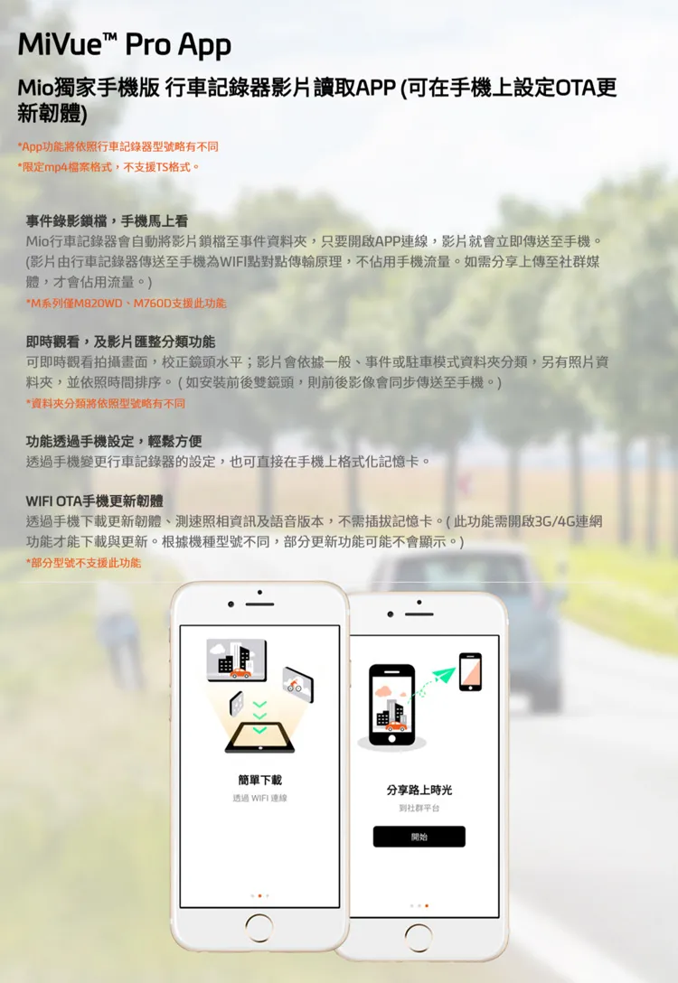 MiVue Pro AppMio獨家手機版 行車記錄器影片讀取APP(可在手機上設定OTA更新韌體)*App功能將依照行車記錄器型號略有不同*限定mp4案格式,不支援TS格式。事件錄影鎖檔,手機馬上看Mio行車記錄器會自動將影片鎖檔至事件資料,只要開啟APP連線,影片就會立即傳送至手機。(影片由行車記錄器傳送至手機為WIFI點對點原理,不佔用手機流量。如需分享上傳至媒體,才會佔用流量。)*M系列僅M820WDM760D支援此功能即時觀看,及影片匯整分類功能可即時觀看拍攝畫面,校正鏡頭水平;影片會依據一般、事件或駐車模式資料夾分類,另有照片資料夾,並依照時間排序。(如安裝前後雙鏡頭,則前後影像會同步傳送至手機。)*資料夾分類將依照型號略有不同功能透過手機設定,輕鬆方便透過手機變更行車記錄器的設定,也可直接在手機上格式化記憶卡。WIFI OTA手機更新韌體透過手機下載更新韌體、測速照相資訊及語音版本,不需插拔記憶卡。(此功能需開啟3G/4G連網功能才能下載與更新。根據機種型號不同,部分更新功能可能不會顯示。)*部分型號不支援此功能簡單下載分享路上時光透過WIFI連線社群平台開始