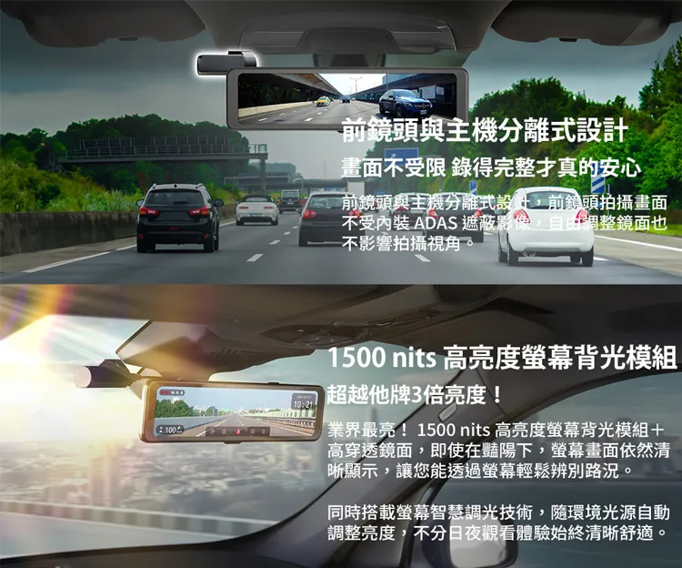 前鏡頭與主機分離式設計畫面不受限 錄得完整真的安心前鏡頭與主機分離式設計,前鏡頭拍攝畫面不受內裝ADAS 遮蔽影像,自由調整鏡面也不影響拍攝視角。10:211500 nits 高亮度背光模組超越他牌3倍亮度!業界最亮!1500 nits 高亮度螢幕背光模組+高穿透鏡面,即使在豔陽下,螢幕畫面依然清晰顯示,讓您能透過螢幕輕鬆辨別路況。同時搭載螢幕智慧調光技術,隨環境光源自動調整亮度,不分日夜觀看體驗始終清晰舒適。