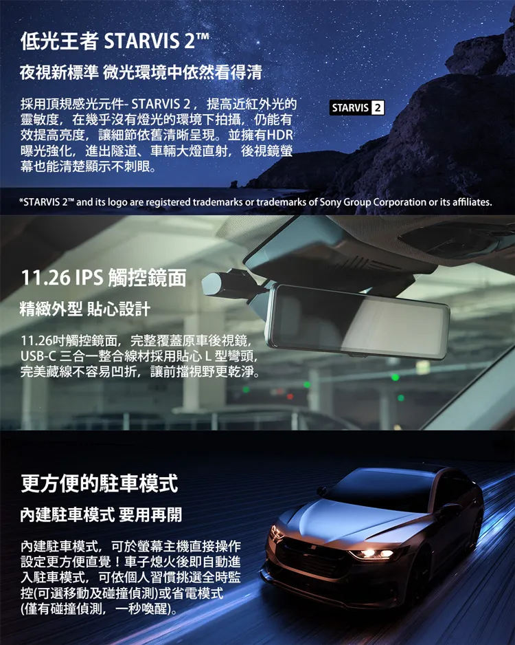 低光王者 STARVIS 2 夜視新標準 微光環境中依然看得清採用頂規感光元件-STARVIS2,提高近紅外光的靈敏度,在幾乎沒有燈光的環境下拍攝,仍能有效提高亮度,讓細節依舊清晰呈現並擁有HDR曝光強化,進出隧道、車輛大燈直射,後視鏡幕也能清楚顯示不刺眼。STARVIS 2STARVIS 2 and its logo are registered trademarks or trademarks of Sony Group Corporation or its affiliates.11.26 IPS 觸控鏡面精緻外型 貼心設計11.26吋觸控鏡面,完整覆蓋原車後視鏡USB-C 三合一整合線材採用貼心L型彎頭,完美藏線不容易凹折,讓前擋視野更乾淨。更的駐車模式內建駐車模式 要用再開內建駐車模式,可於螢幕主機直接操作設定更方便直覺! 後即自動進入駐車模式,可依個人習慣挑選全時監控(可選移動及碰撞偵測或省電模式(僅有碰撞偵測,一秒喚醒)。