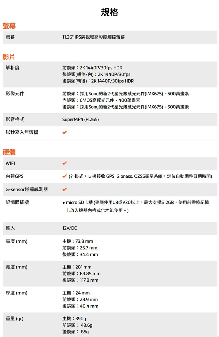 螢幕螢幕影片解析度規格11.26 IPS廣視域高彩度觸控螢幕影像元件影音格式秒寫入無壞檔前鏡頭1440P/30fps HDR後鏡頭(朝側/2K 1440P/30fps後鏡頭(朝後:2K1440P/30fps HDR前鏡頭:採用Sony的新2代星光級感光元件(IMX675)、500萬畫素內鏡頭:CMOS高感光元件、400萬畫素後鏡頭:採用Sony的新2代星光級感光元件(IMX675)、500萬畫素SuperMP4 (H.265)硬體WIFI內建GPSG-sensor碰撞感測器記憶體插槽(外掛式支援接收GPS, Glonass, QZSS衛星系統,定位自動調整日期時間)micro SD卡槽(建議使用U3或V30以上,最大支援512GB,使用前需將記憶卡放入機器內格式化才能使用。)輸入高度(mm)12V/DC主機:73.8mm前鏡頭:25.7 mm後鏡頭:34.4mm寬度 (mm)主機:281mm前鏡頭:69.85mm後鏡頭:117.8mm厚度(mm)主機:24 mm前鏡頭:28.9 mm後鏡頭:40.4mm重量(gr)主機:390g前鏡頭:43.6g後鏡頭:85g