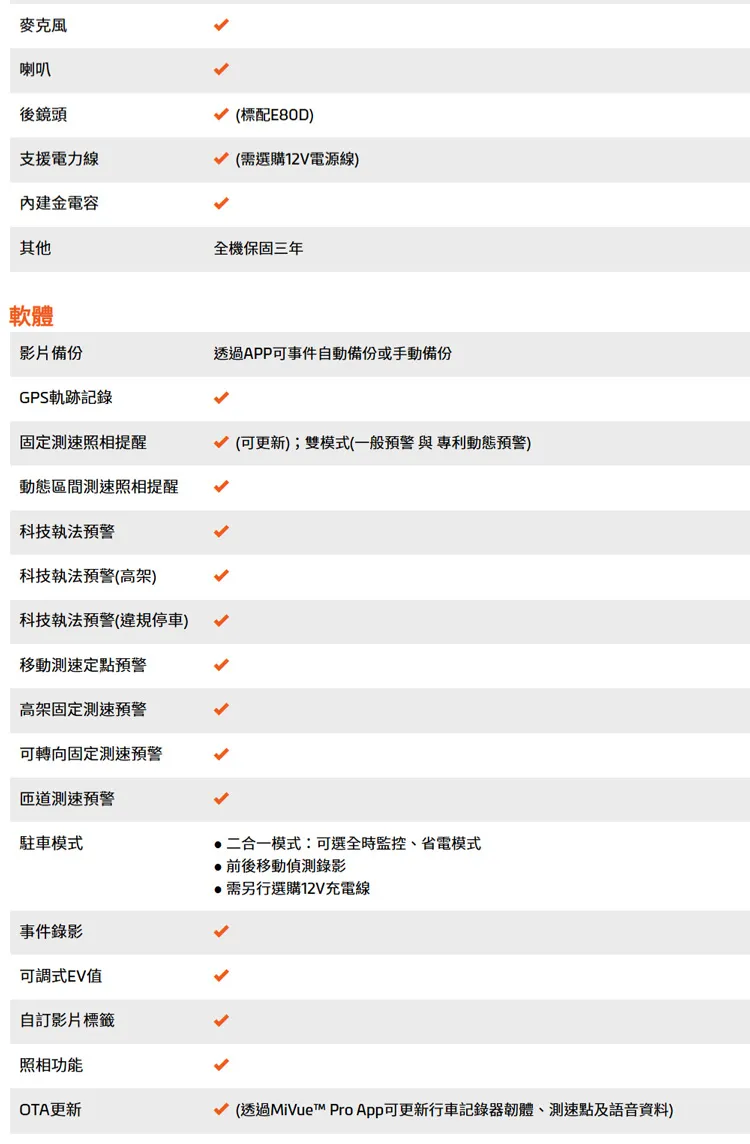麥克風喇叭後鏡頭支援電力線內建其他(標配E80D)(需選購12V電源線)全機保固三年軟體影片備份GPS軌跡記錄固定測速照相提醒動態區間測速照相提醒科技執法預警科技執法预警(高架)科技執法預警(停車)移動測速定點預警高架固定測速預警可轉向固定測速預警透過APP可事件自動備份或手動備份(可更新);雙模式(一般預警與專利動態預警)測速預警駐車模式二合一模式:可選全時監控省電模式事件錄影可調式EV值自訂影片標籤照相功能OTA更新前後移動偵測錄影需另行選購12V充電線(透過MiVue™ Pro App可更新行車記錄器韌體、測速點及語音資料