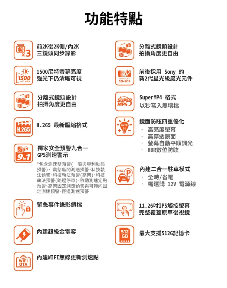功能特點前2K後2K側/內2K三鏡頭同步錄影 1500螢幕亮度1500 強光下仍清晰可視SENSOR分離式鏡頭設計拍攝角度更自由前後採用 Sony 的新2代星光級感光元件nits分離式鏡頭設計SUPERSuperMP4 格式拍攝角度更自由MP4以秒寫入無壞檔鏡面防眩四重優化H265 最新壓縮格式AUTOH265 高亮度螢幕獨家安全預警九合一GPS測速警示*包含測速雙預警(一般與專利動態預警)、動態區間測速預警、科技執法預警、科技執法預警(高架)、科技執法預警(路邊停車)、移動測速定點預警、高架固定测速預警與可轉向固定測速預警、匝道測速預警緊急事件錄影鎖檔·高穿透鏡面螢幕自動平順調光.HDR數位防眩內建二合一駐車模式(P).全時/省電需選購 12V 電源線11.26吋IPS觸控螢幕完整覆蓋原車後視鏡內建超級金電容512最大支援512G記憶卡GB內建WIFI無線更新測速點WIFIOTA