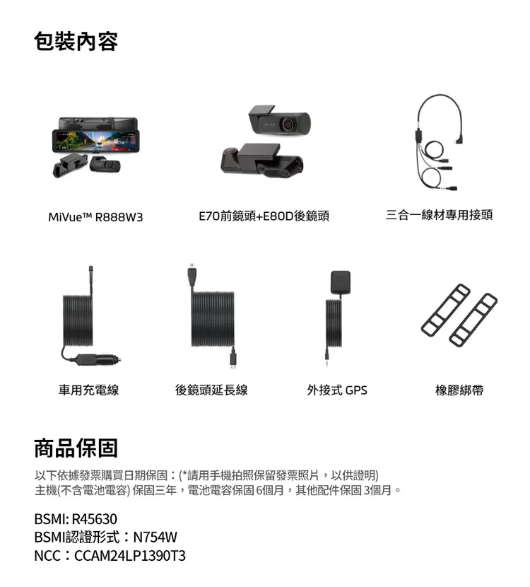 包裝內容MiVuet R888W3E70前鏡頭+E80D後鏡頭三合一線材專用接頭車用充電線後鏡頭延長線外接式 GPS橡膠綁帶商品保固以下依據發票購買日期保固:(*請用手機拍照保留發票照片,以供證明)主機(不含電池電容)保固三年,電池電容保固6個月,其他配件保固3個月。BSMI: R45630BSMI認證形式:N754WNCC:CCAM24LP1390T3