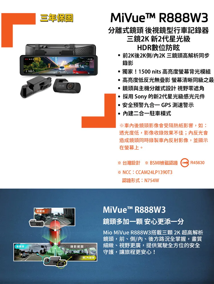 年MiVuet R888W3分離式鏡後視鏡型行車記録器三鏡2K 新2代星光級HDR數位防眩前2K後2K2K三鏡頭高解析同步錄影獨家!1500 nits 高亮度螢幕背光模組高亮度低反光無影 螢幕清晰同級之最三鏡頭與主機分離式設計視野零遮角採用 Sony 的新2代星光級感光元件安全預警九合一 GPS測速警示建二合一駐車模式車內後鏡頭影像會受隔熱紙影響,如:透光度低,影像收錄效果不佳;內反光會造成鏡頭同時錄製車內反射影像,並顯示在螢幕上。※ 台灣設計 ※ BSMI檢磁認證R45630※ NCC:CCAM24LP1390T3認證形式:N754W錄影範圍側/內頭MiVue R888W3鏡頭多加一顆 安心更添一分Mio MiVue R888W3搭載三顆 2K超高解析鏡頭,前、側/內、後方路況全掌握,畫質細緻、視野更廣,提供駕駛全方位的安全守護,讓旅程更安心!