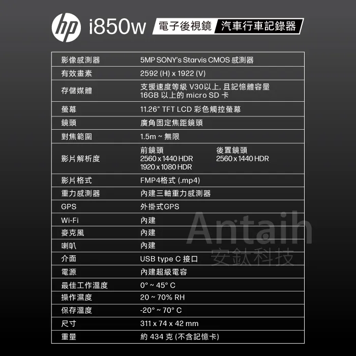 i85w 汽車行車記錄器影像感測器5MP SONYs Starvis MOS 感測器有效畫素存儲媒體螢幕2592 (H) 1922 (V)支援速度等級 V30以上,且記憶體容量16GB 以上的 micro SD卡11.26 TFT LCD 彩色觸控螢幕鏡頭廣角固定焦距鏡頭對焦範圍影片解析度影片格式1.5m~無限前鏡頭2560x1440 HDR1920x1080 HDRFMP4格式 (.mp4)後置鏡頭2560x1440 HDR重力感測器內建三軸重力感測器GPS外掛式GPSAntainUSB type C 接口 鈦科技Wi-Fi內建麥克風內建喇叭內建介面電源最佳工作溫度操作濕度保存溫度尺寸重量內建超級電容0° ~ 45°C20~70% RH-20°~70°C311 x 74 x 42 mm約 434 克 (不含記憶卡)