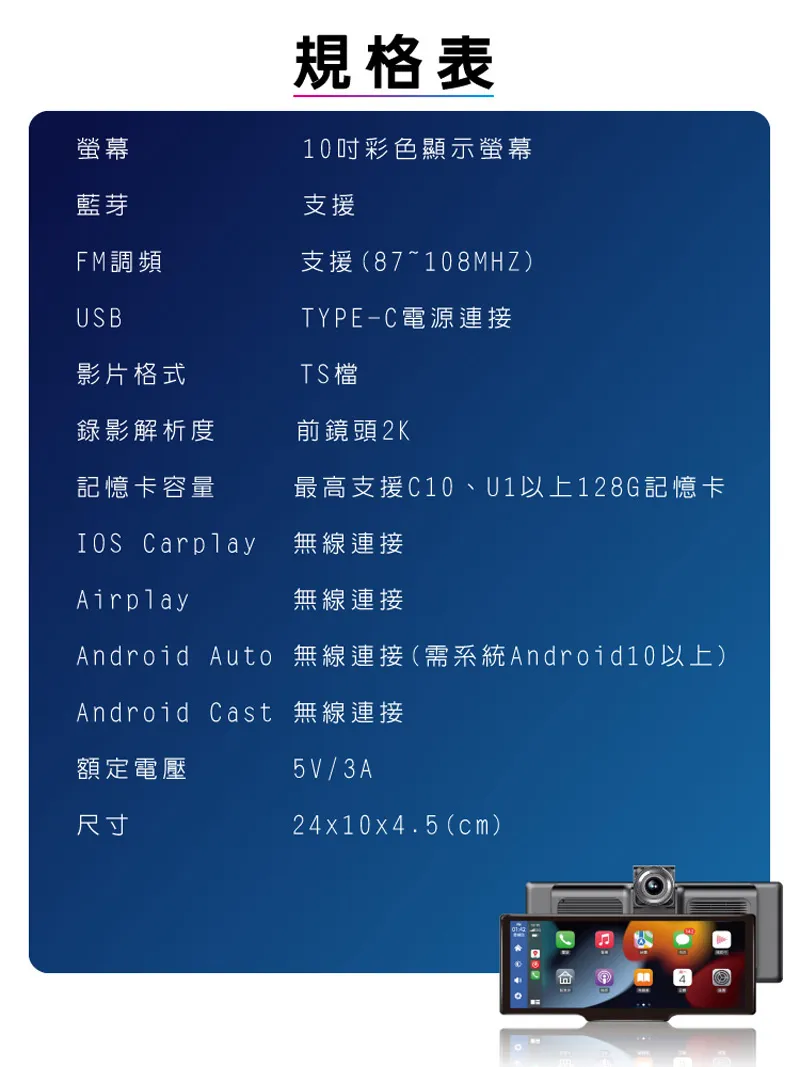 螢幕藍芽規格表10彩色顯示螢幕支援FM調頻支援(87~108MHZ)USTYPE-C電源連接影片格式TS檔錄影解析度前鏡頭2K記憶卡容量最高支援C10、U1以上128G記憶卡IOS Carplay無線連接Airplay無線連接Android Auto 無線連接(需系統Android 10以上)Android Cast 無線連接額定電壓尺寸5V/3A24x10x4.5(cm)B