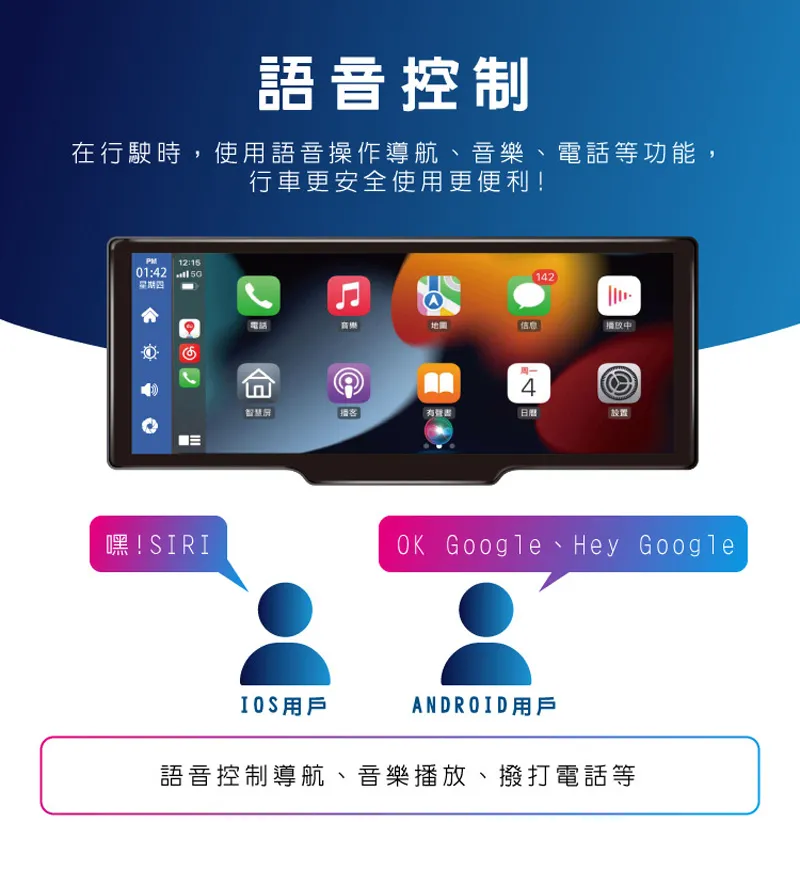 語音控制在行駛時,使用語音操作導航、音樂、電話等功能,行車更安全使用更便利!PM01:42 142地信息播放中4放置嘿!SIRIOK Google Hey Google用戶ANDROID用戶語音控制導航、音樂播放、撥打電話等