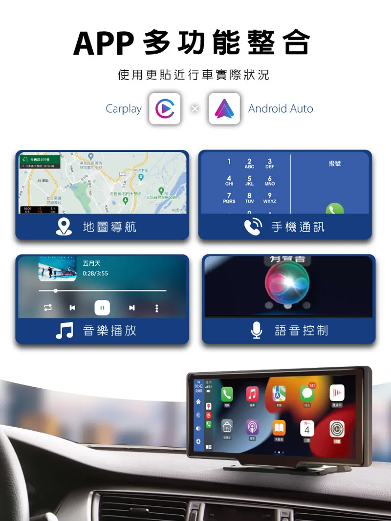 PP多功能整合使用更貼近行車實際狀況rplay C Adroid Auto123撥ABCDEF456GHIJKLMNO號A789PQRSTUVWXYZn地圖導航五天0:28/3:55手機通訊月音樂播放語音控制a4