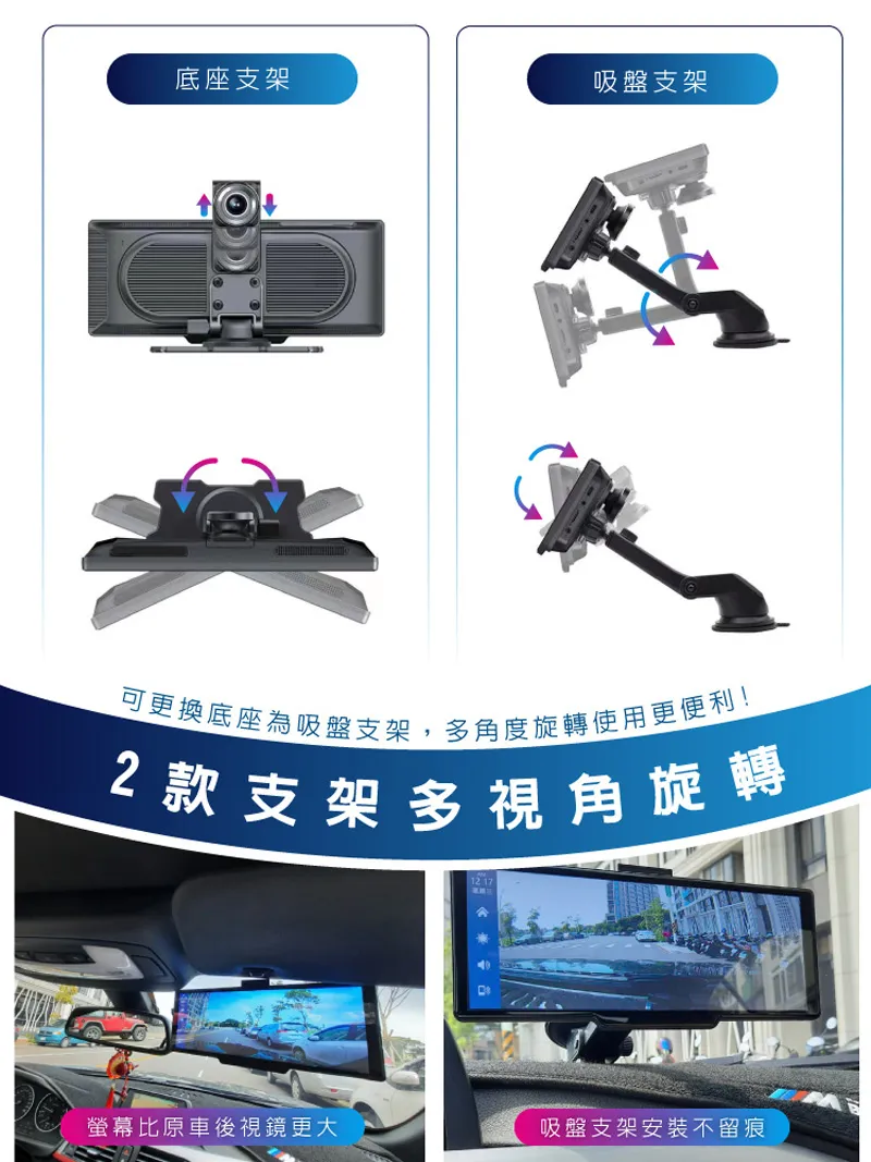 底座支架吸盤支架可更換底座為吸盤支架,多角度旋轉使用更便利!2款支架多視角旋轉螢幕比原車後視鏡更大吸盤支架安裝不留痕