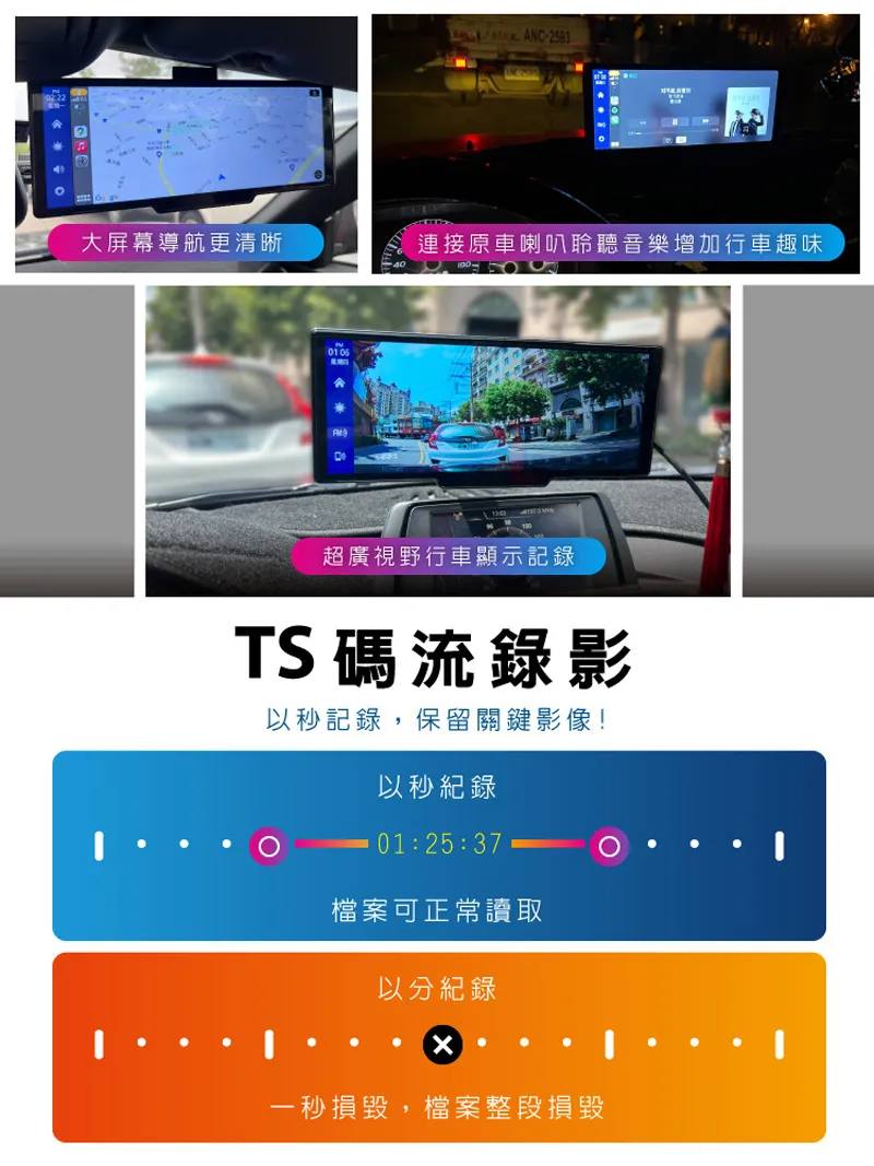 ANC-2593大屏幕導航更清晰連接原車喇叭聆聽音樂增加行車趣味超廣視野行車顯示記錄TS碼流錄影以秒記錄,保留關鍵影像!以秒紀錄01:25:37檔案可正常讀取以分紀錄一秒損毀,檔案整段損毀