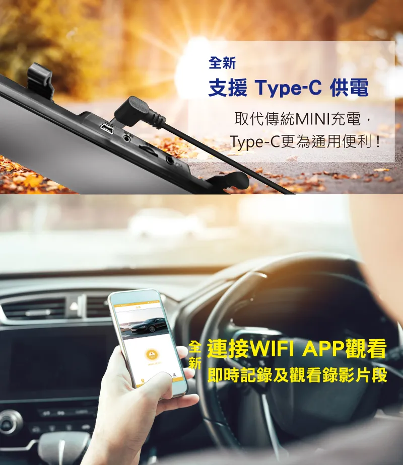新支援 Type-C 供電取代傳統MINI充電,Type-C更為通用便利!全WIFI APP觀看新即時記錄及觀看錄影片段