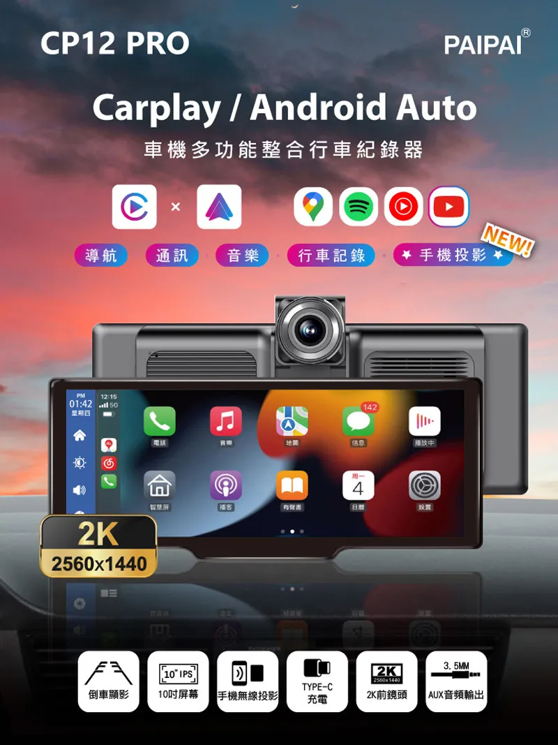 P12 PROCarplayndroid Auto車機多功能整合行車紀錄器CANEW!導航通訊音樂 行車記錄 手機投影 12:1501:42 星期四2560x1440142電話音樂播放中周一4智慧播客10IPSTYPE-C倒車顯影10屏幕 手機無線投影充電2K2560x14403.5MM2K前鏡頭 AUX音頻輸出