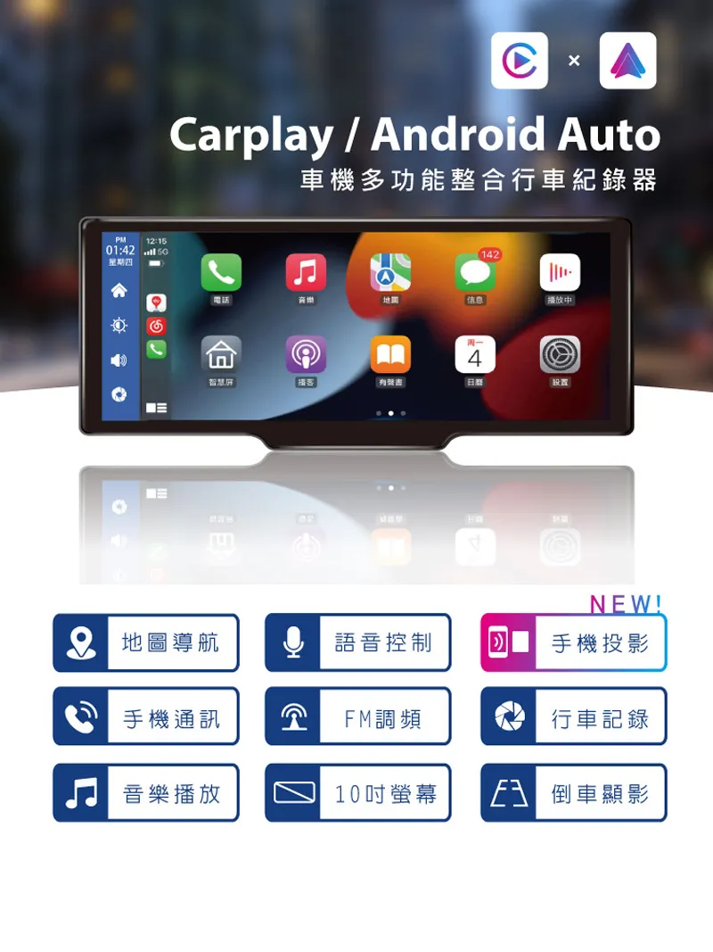 PM01:4212:15星期四-குEarplay / ndroid Auto車機多功能整合行車紀錄器142音樂信息播放4智慧NEW!A 地圖導航語音控制手機投影手機通訊FM調頻行車記錄C音樂播放10吋螢幕 倒車顯影