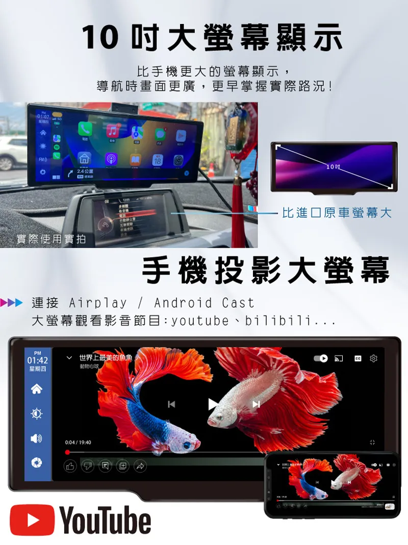 010710 大顯示手機更大的螢幕顯示,導航時畫面更廣,更早掌握實際路況!公里實際使用實拍10吋比原車螢幕大手機投影大螢幕 連接 Airplay / Android Cast大螢幕觀看影音節目:youtube、bilibili...PM01:42星期四世界上最美的魚魚動物心球0:04/19:40 YouTube