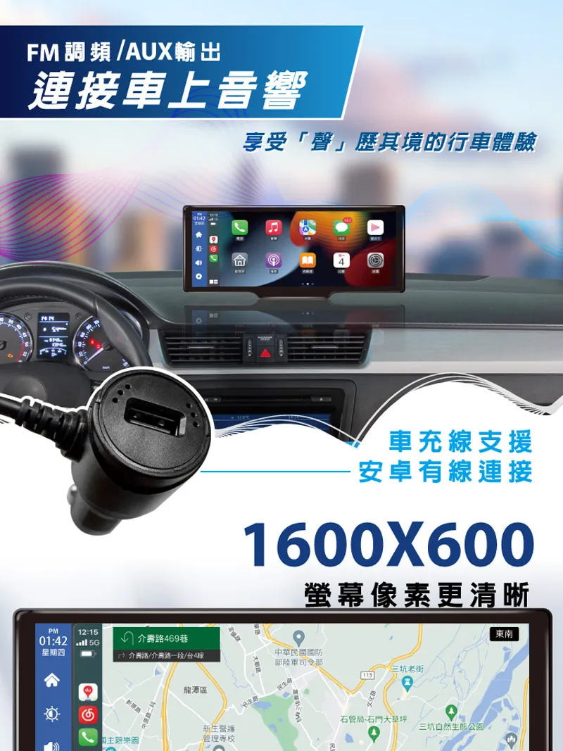 FM調頻AUX輸出連接車上音響12:1501:42 星期四享受「聲」歷其境的行車體驗車充線支援安卓有線連接1600X600螢幕像素更清晰 路469巷 介壽路/路一/台4段中華民國防部陸軍司令部三坑老街龍潭區新生醫護國樂園管理專校民石管局石門大草坪三坑自然生態東南