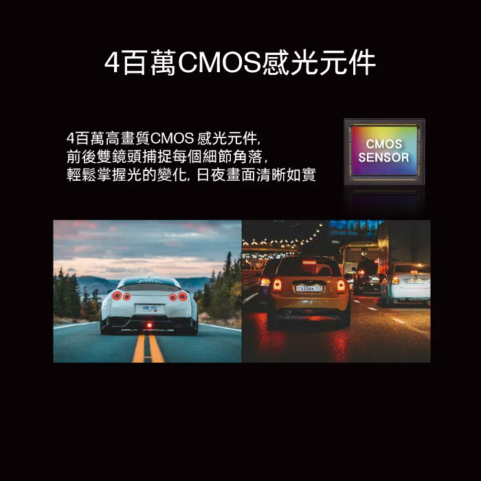 4百萬CMOS感光元件4百萬高畫質CMOS 感光元件,CMOS前後雙鏡頭捕捉每個細節角落,輕鬆掌握光的變化,日夜畫面清晰如實SENSOR