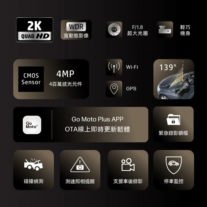 WDRQUAD HD 寬動態影像F/1.8輕巧超大光圈機身Wi-Fi139CMOS4MPSensor4百萬感光元件GPSGo Moto Plus APPGoMototOTA線上即時更新韌體緊急錄影鎖檔碰撞偵測測速照相提醒支援車後錄影停車監控