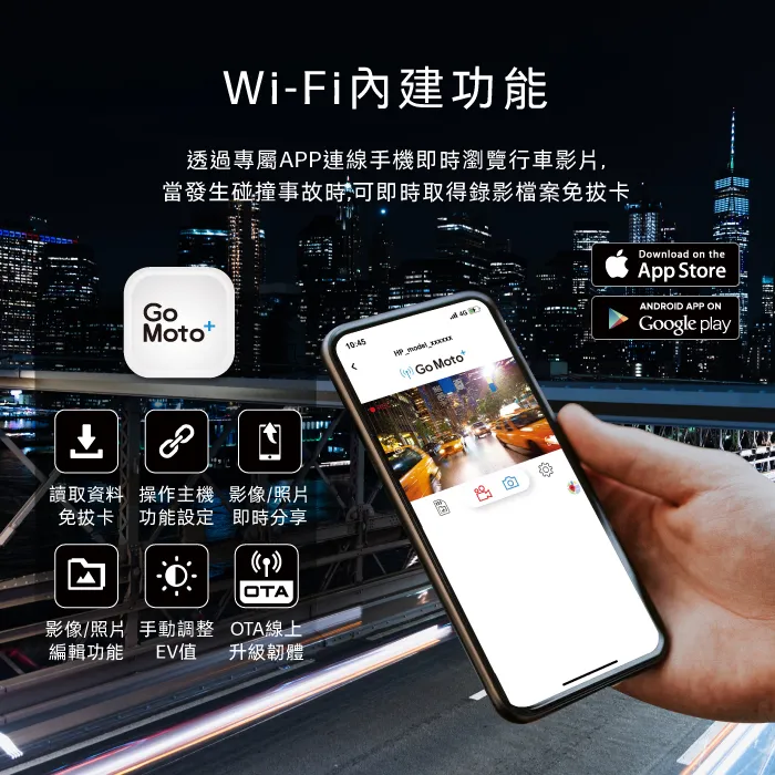 Wi-Fi內建功能透過專屬APP連線手機即時瀏覽行車影片,當發生碰撞事故時可即時取得錄影檔案免卡Motot10:45 Go Moto讀取資料 操作主機 影像/照片免拔卡功能設定 即時分享影像/照片 手動調整 OTA線上編輯功能 EV值升級韌體Download on theApp StoreANDROID APP ONGoogle play
