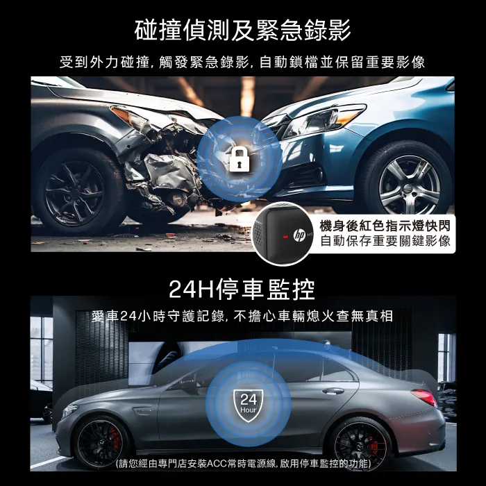 碰撞偵測及緊急錄影受到外力碰撞, 觸發緊急錄影,自動鎖檔並保留重要影像機身後紅色指示燈快閃自動保存重要關鍵影像24H停車監控愛車24小時守護記錄,不擔心車輛熄火查無真相24Hour(請您經由專門店安裝ACC常時電源線, 啟用停車監控的功能)