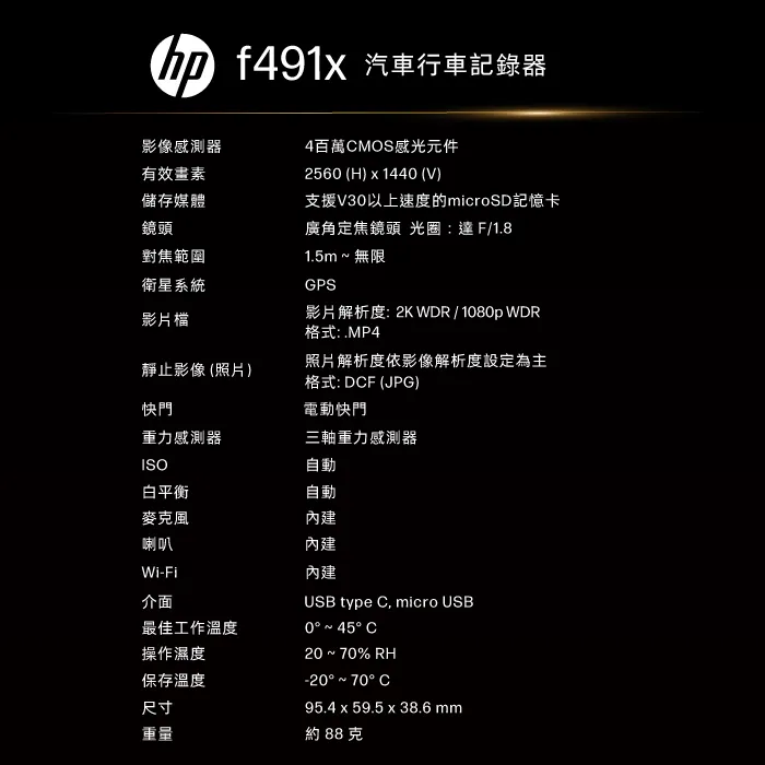 影像感測器有效畫素f491X 汽車行車記錄器4百萬CMOS感光元件256 (H) 1440 (V)支援V30以上速度的microSD記憶卡儲存媒體鏡頭廣角定焦鏡頭 光圈:達F/1.8對焦範圍衛星系統影片檔1.5m~無限GPS影片解析度: 2K WDR/1080p WDR格式: .MP4靜止影像 (照片)照片解析度依影像解析度設定為主格式: DCF (JPG)快門電動快門重力感測器ISO三軸重力感測器白平衡自動自動麥克風內建喇叭Wi-Fi介面最佳工作溫度操作濕度保存溫度尺寸重量內建內建USB type C micro USB0°~45°C20~70% RH-20°~70°C95.4 x 59.5 x 38.6 mm約88克