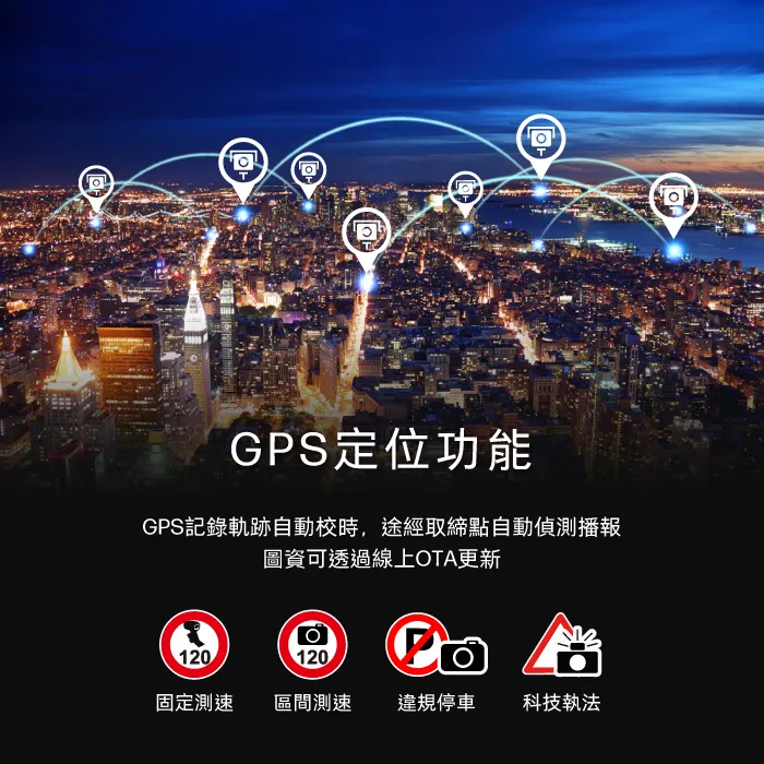 GPS定位功能GPS記錄軌跡自動校時,途經取締點自動偵測播報圖資可透過線上OTA更新120固定測速區間測速 違規停車 科技執法120