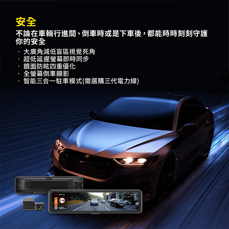 安全不論在車輛行進間、時或是下車後,都能時時刻刻守護你的安全·大廣角減低盲區視覺死角超低延遲即時同步鏡面防眩四重優化全螢幕倒車顯影智能三合一駐車模式(需選購三代電力線)110100