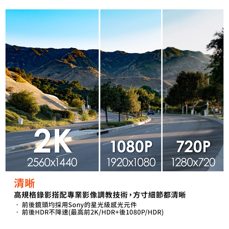 2K2560x1440清晰1080P 720P1920x1080 1280x720高規格錄影搭配專業影像調教技術,方寸細節都清晰前後鏡頭均採用Sony的星光級感光元件前後HDR不降速(最高前2K/HDR+後1080P/HDR)