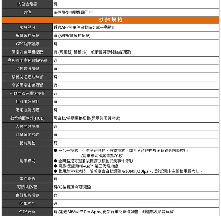 內建金電容其他主機及後鏡頭保固三年軟體規格影片備份智慧聲控指令GPS軌跡記錄透過APP事件自動備份或手動備份(5種智慧聲控指令)有固定測速照相提醒有(可更新)雙模式(一般預警與專利動態預警)動態區間測速照相提醒有科技執法預警有移動測速定點預警高架固定測速預警可轉向固定測速預警有有有自訂測速照相有定速巡航提醒有數位鏡面模式(HUD)可自動/手動更換切換(顯示時間與車速)大燈開啟提醒有疲勞駕駛提醒有節能駕駛駐車模式有三合一模式:可選全時監控、省電模式,或者全時監控與時錄影同時啟用(駐車模式檔案皆為20秒)全時監控可選前後雙鏡頭移動偵測事件錄影需另行選購MiVue™ 第三代電力線使用駐車模式時,解析度會自動調整為1080P/30fps,以達記憶卡空間使用最大化。事件錄影可調式EV值有有(前後鏡頭均可調整)自訂影片標籤有照相功能有OTA更新有(透過MiVue™ Pro App可更新行車記錄器韌體、測速點及語音資料)