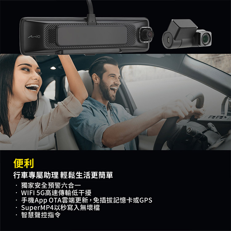 便利行車專屬助理 輕鬆生活更簡單獨家安全預警六合一WIFI 5G高速傳輸低干擾手機App OTA雲端更新,免插拔記憶卡或GPSSuperMP4以秒寫入無壞檔智慧聲控指令