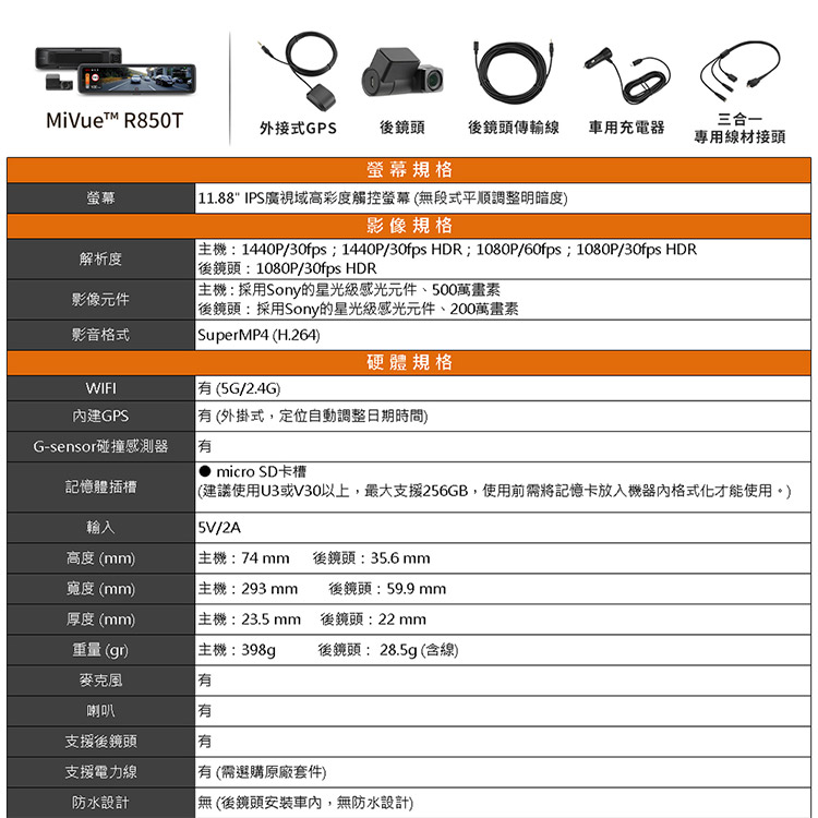 MiVuet R850T外接式GPS三合一後鏡頭 後鏡頭傳輸線車用充電器專用線材接頭螢幕規格螢幕解析度影像元件影音格式WIFI建GPS 11.88" IPS廣視域高彩度觸控螢幕(無段式平順調整明暗度影像規格主機:1440P/30fps 1440P/30fps HDR; 1080P/60fps; 1080P/30fps HDR後鏡頭:1080P/30fps HDR主機:採用Sony的星光級感光元件、500萬畫素後鏡頭:採用Sony的星光級感光元件、200萬畫素 SuperMP4 (H.264)(5G/2.4G)硬體規格(外掛式,定位自動調整日期時間)G-sensor碰撞感測器有記憶體插槽輸入micro SD卡槽(建議使用U3或V30以上,最大支援256GB,使用前需將記憶卡放入機器內格式化才能使用。)/2A高度 (mm)寬度 (mm)厚度 (mm)主機:74mm主機:293mm主機:23.5mm後鏡頭:35.6 mm後鏡頭:59.9 mm後鏡頭:22mm重量(g)麥克風主機:398g有後鏡頭:28.5g(含線)喇叭有支援後鏡頭有支援電力線有(需選購原廠套件)防水設計無(後鏡頭安裝,無防水設計