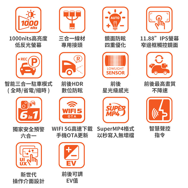 1000AUTOnits1000nits高亮度低反光螢幕三合一線材鏡面防眩11.88IPS螢幕專用接頭四重優化窄邊框觸控鏡面 RECP(R)LOWLIGHTSENSOR智能三合一駐車模式前後HDR前後前後最高畫質(全時/省電/縮時)位防眩星光級感光不降速6in1獨家安全預警六合一UX新世代操作介面設計WIFI 5ОТАWIFI 5G高速下載手機OTA更新EV前後可調EV值SUPERMP4SuperMP4格式以秒寫入無壞檔智慧聲控指令