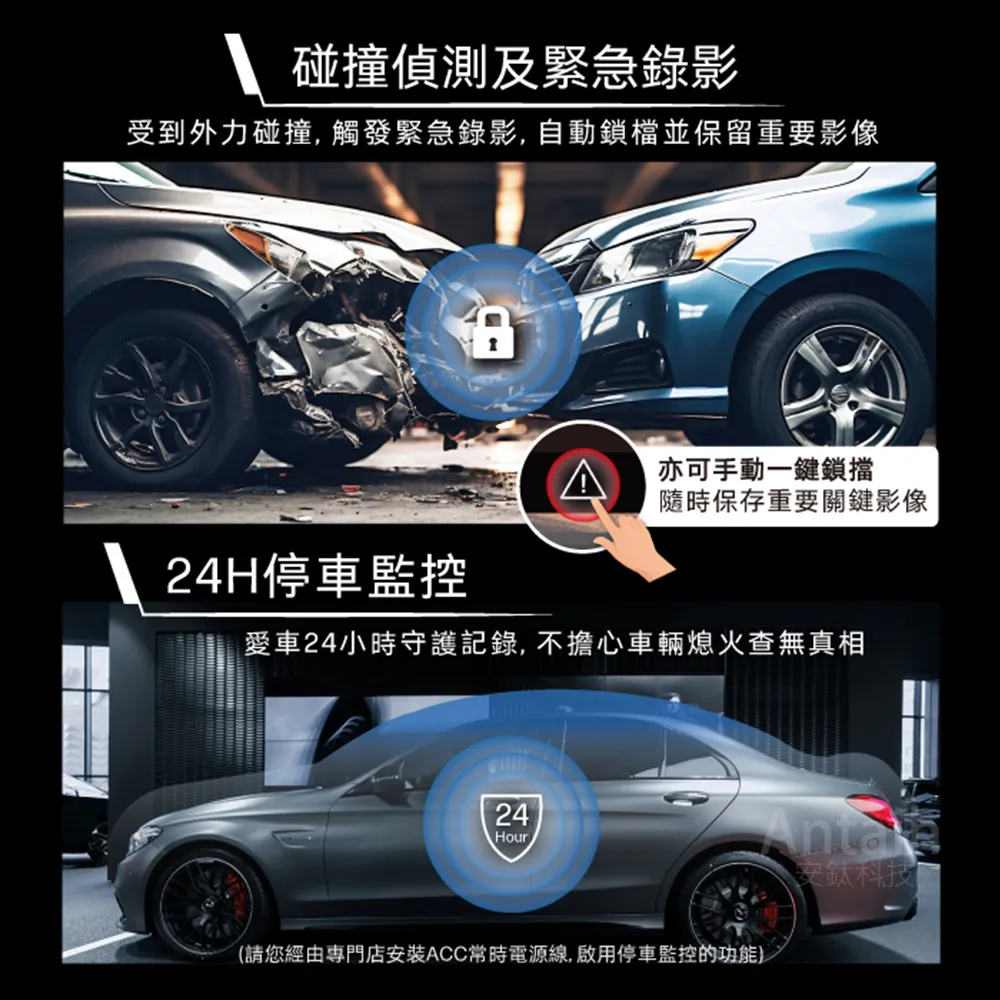 碰撞偵測及緊急錄影受到外力碰撞,觸發緊急錄影,自動鎖並保留重要影像亦可手動一鍵鎖擋隨時保存重要關鍵影像24H停車監控愛車24小時守護記錄,不擔心車輛熄火查無真相24Hour(請您經由專門店安裝ACC時電源線,啟用停車監控的功能)Antas安鈦科技