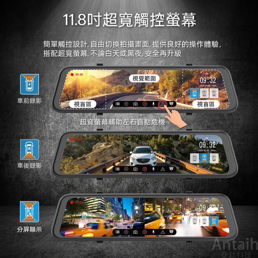 11.8觸控簡單觸控設計,自由切換拍攝畫面,提供良好的操作體驗,搭配超寬螢幕, 不論白天或黑夜,安全再升級00:30視覺範圍09:32 視盲區車前錄影視盲區超寬螢幕輔助左右盲點危機車後錄影分屏顯示09:32 Antaih安鈦科技
