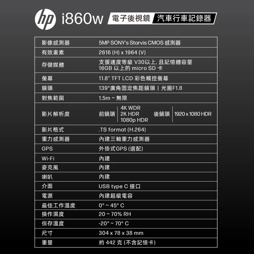 電子後視鏡 汽車行車記錄器影像感測器有效存儲媒體螢幕5MP SONYs Starvis CMOS 感測器2616 (H) x 1964 (V)支援速度等級 V3以上,且記憶體容量16GB 以上的micro SD卡11.8 TFT LCD 彩色觸控螢幕139°廣角固定焦距鏡頭 光圈F1.8鏡頭對焦範圍1.5m~無限4K WDR影片解析度前鏡頭 2K HDR1080p HDR後鏡頭| 1920x1080 HDR影片格式.TS format (H.264)重力感測器內建三軸重力感測器GPS外掛式GPS (選配)Wi-Fi麥克風喇叭介面電源最佳工作溫度操作濕度保存溫度尺寸重量內建內建內建USB type C 接口內建超級電容0° ~ 45°C20~70% RH-20°~70°C304 x 78 x 38mm約 442 克(不含記憶卡)