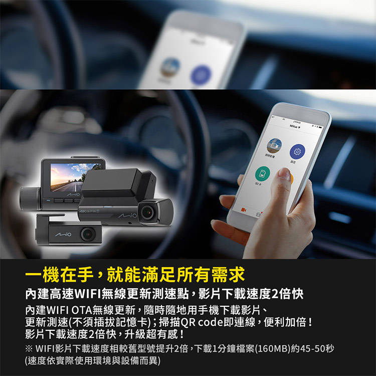 一機在手,就能滿足所有需求內建高速WIFI無線更新測速點,影片下載速度2倍快內建WIFI OTA無線更新,隨時隨地用手機下載影片、更新測速(不須插拔記憶卡);掃描QRcode即連線,便利加倍!影片下載速度2倍快,升級超有感!※ WIFI影片下載速度相較舊型號提升2倍,下載1分鐘檔案(160MB)約45-50秒(速度依實際使用環境與設備而異)