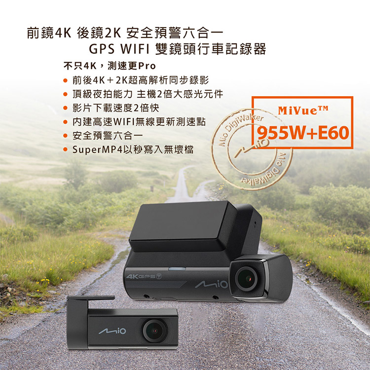 Mio MiVue 955W+E60 前鏡4K後鏡2K 安全預警六合一 GPS WIFI 雙鏡頭行車記錄器
