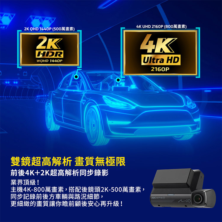 QHD 1440P (500萬畫素)2KHDR 1440P4K UHD 2160P (800萬畫素)4KUltra HD2160P雙鏡超高解析 畫質無極限前後4K+2K超高解析同步錄影業界頂級!主機4K-800萬畫素,搭配後鏡頭2K-500萬畫素,同步記錄前後方車輛與路況細節,更細緻的畫質讓你瞻前顧後安心再升級!