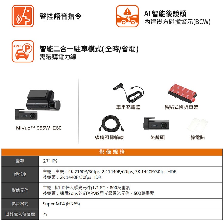 A 聲控語音指令AI智能後鏡頭內建後方碰撞警示(BCW)(P) 智能二合一駐車模式(全時省電)需選購電力線車用充電器黏貼式快拆車架MiVue 955W+E60後鏡頭傳輸線後鏡頭靜電貼影像規格螢幕2.7