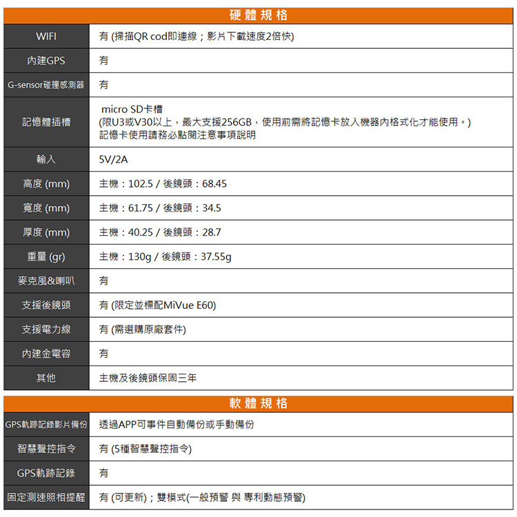 WIFI硬體規格 (掃描QR cod即連線;影片下載速度2倍快)內建GPSG-sensor碰撞感測器記憶體插槽micro SD卡槽(限U3或V30以上,最大支援256GB,使用前需將記憶卡放入機器內格式化才能使用)記憶卡使用請務必點閱注意事項說明輸入5V/2A高度 (mm)主機:102.5/後鏡頭:68.45寬度 (mm)主機:61.75 /後鏡頭:34.5厚度(mm)重量(gr)麥克風&喇叭主機:40.25 /後鏡頭:28.7主機:130g/後鏡頭:37.55g支援後鏡頭(限定並標配MiVue 60)支援電力線 (需選購原廠套件)內建金電容有其他主機及後鏡頭保固三年軟體規格GPS軌跡記錄影片備份 透過APP可事件自動備份或手動備份智慧聲控指令有 (5種智慧聲控指令)GPS軌跡記錄有 固定測速照相 有(可更新);雙模式(一般與 專利動態預警)