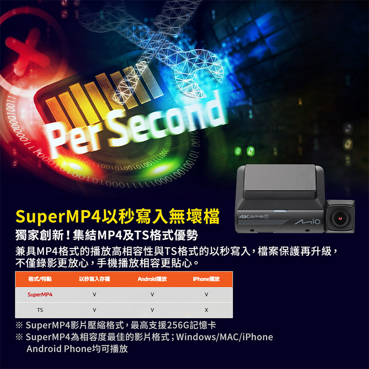 Per Second0100SuperMP4以秒寫入無壞檔獨家創新!集結MP4及TS格式優勢兼具MP4格式的播放高相容性與TS格式的以秒寫入,檔案保護再升級,不僅錄影更放心,手機播放相容更貼心。格式/特點以秒寫入存檔Android播放iPhone播放SuperMP4TS SuperMP4 SuperMP4 Windows/MAC/iPhoneAndroid Phone