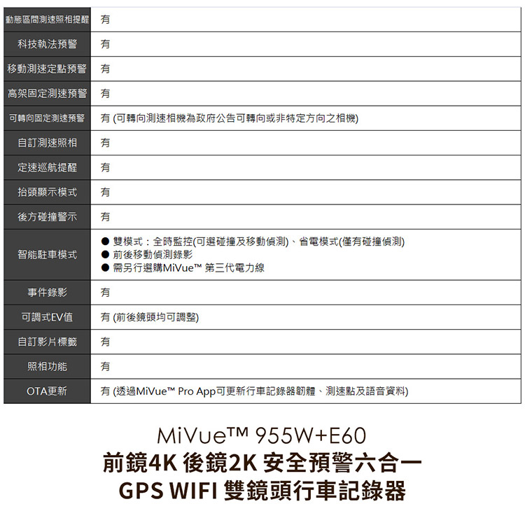 動態區間測速照相提醒科技執法預警 移動測速定點預警 「高架固定測速預警 可轉向固定測速預警 (可轉向測速相機為政府公告可轉向或非特定方向之相機自訂測速照相定速巡航提醒抬頭顯示模式後方碰撞警示有智能駐車模式雙模式:全時監控(可選碰撞及移動偵測)省電模式(僅有碰撞偵測)●前後移動偵測錄影需另行選購 第三代電力線事件錄影有可調式EV值有 (前後鏡頭均可調整)自訂影片標籤有照相功能有OTA更新有 (透過MiVue™ Pro 可更新行車記錄器韌體、測速點及語音資料)MiVue™ 955W+E60前鏡4K 後鏡2K 安全預警六合一GPS WIFI 雙鏡頭行車記錄器