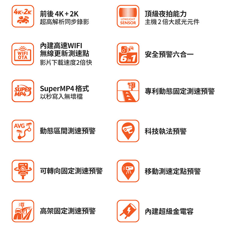 + 前後4K+2K頂級夜拍能力LOLIGHT超高解析同步錄影SENSOR主機2倍大感光元件內建高速WIFIWIFI無線更新測速點OTA影片下載速度2倍快6in1安全預警六合一 SuperMP4 專利動態固定測速預警 MP4以秒寫入無壞檔AVG動態區間測速預警可轉向固定測速預警W科技執法預警移動測速定點預警高架固定測速預警內建超級金電容