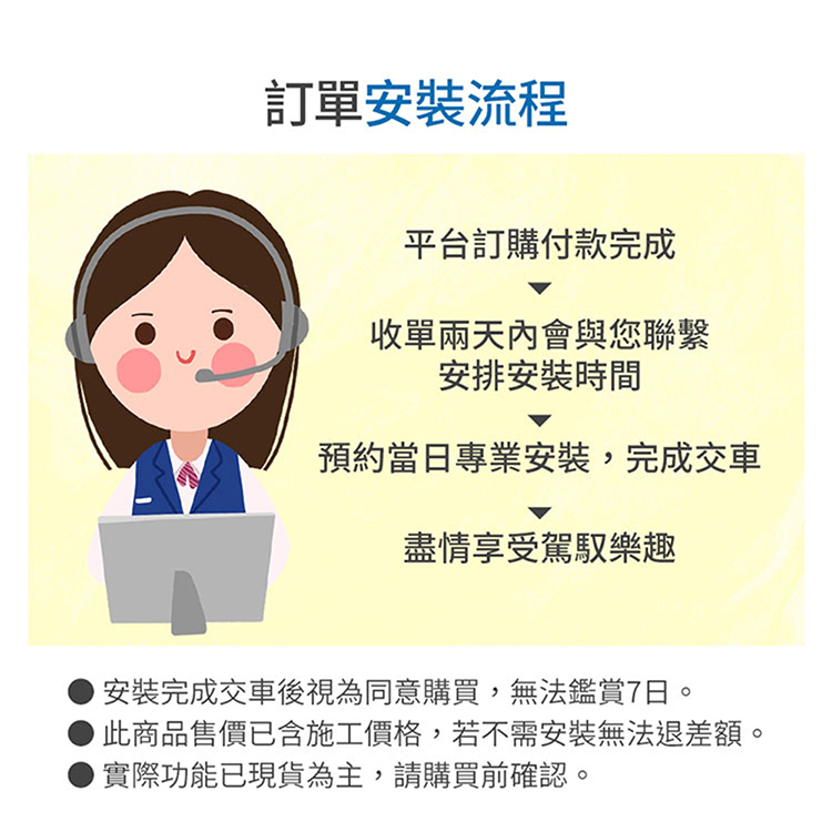 訂單安裝流程平台訂購付款完成收單兩天內會與您聯繫安排安裝時間預約當日專業安裝,完成交車盡情享受駕馭樂趣安裝完成交車後視為同意購買,無法鑑賞日。此商品售價已含施工價格,若不需安裝無法退差額。實際功能已現貨為主,請購買前確認。