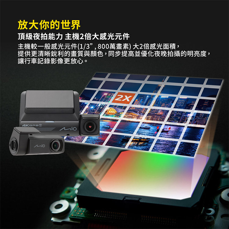 放大你的世界頂級夜拍能力 主機2倍大感光元件主機較一般感光元件(1/3”,800萬畫素)大2倍感光面積,提供更清晰銳利的畫質與顏色,同步提高並優化夜晚拍攝的明亮度,讓行車記錄影像更放心。
