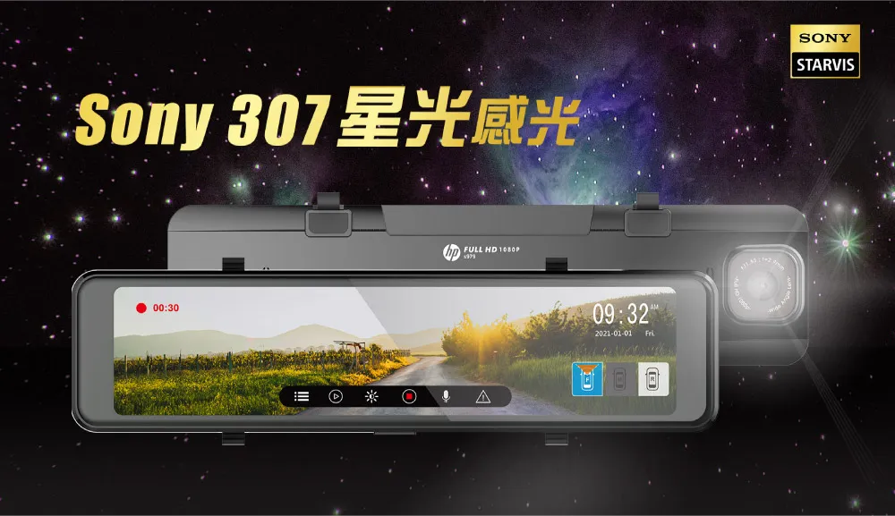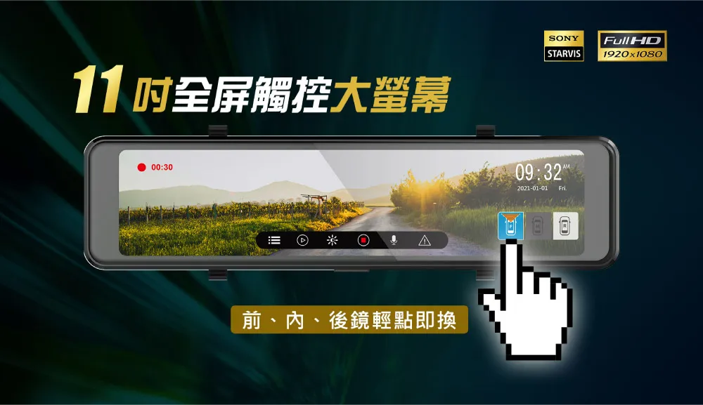 11全屏觸控大00:30SNYSTRVIS09:32M2021-01-01Fri.Full HD1920x1080育 OA前、內、後鏡輕點即換