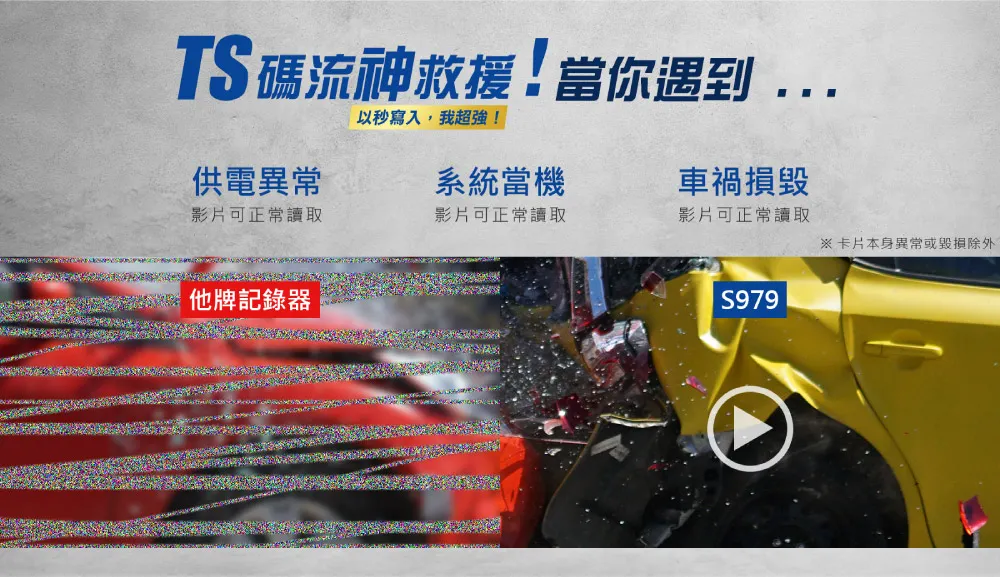 TS碼流神救援!當你遇到以寫入,我超強!供電異常系統當機車禍損毀影片可正常讀取影片可正常讀取影片可正常讀取※卡片本身異常或毀損除外他牌記錄器S979