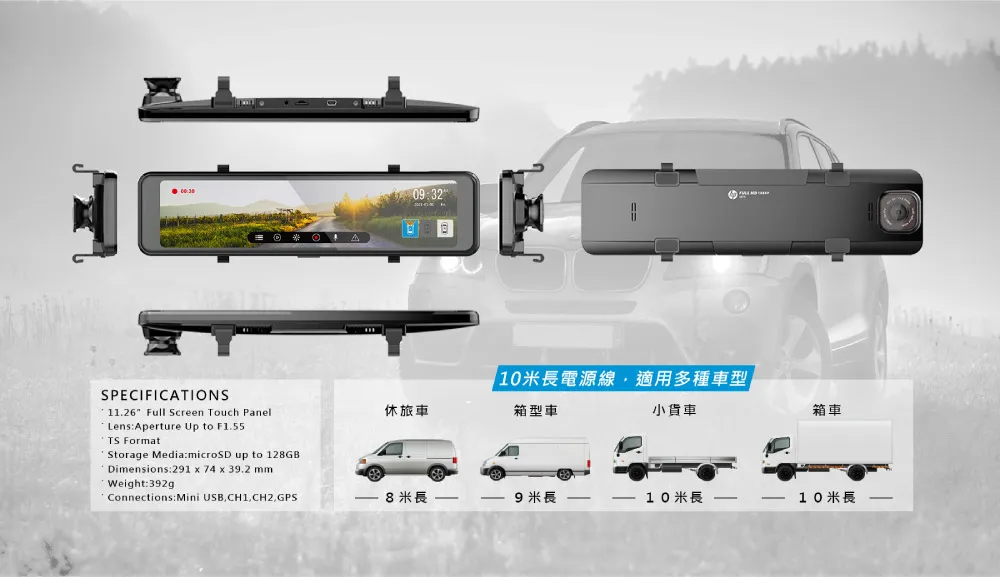 SPECIFICATIONS11.26 Full Screen Touch PanelLens:Aperture Up to F1.55TS FormatStorage Media:microSD up to 128GBDimensions:291x74x39.2mmWeight:392gConnections:Mini USB 09:32休旅車10米長電源線,適用多種車型箱型車小貨車箱車8米長--9米長--10米長-10米長-