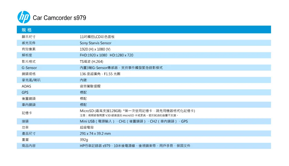 Car Camcorder s979規格顯示尺寸感光元件有效像素解析度影片格式G-Sensor鏡頭規格麥克風/喇叭ADASGPS後置鏡頭車內鏡頭記憶卡接頭功率產品尺寸商品內容11觸控LCD彩色面板Sony Starvis Sensor1920 (H) 1080 (V)FHD:1920x1080HD:1280x720TS碼流 (H.264)內置3軸G-Sensor傳感器支持事件觸發緊急錄影模式136 度超廣角F1.55 光圈內建疲勞駕駛提醒標配標配標配MicroSD (最高支援128GB) *第一次使用記憶卡請先用機器格式化記憶卡)注意:視頻錄製需要 V30 級速度的 microSD 卡或更高低於8GB的容量不支援。Mini USB(電源輸入)、CH1(後置鏡頭)、CH2(車內鏡頭)、GPS超級電容291x74x39.2 mm392gpHP行車記錄器 979、10米後電源線、後視鏡、用戶手冊、保固文件