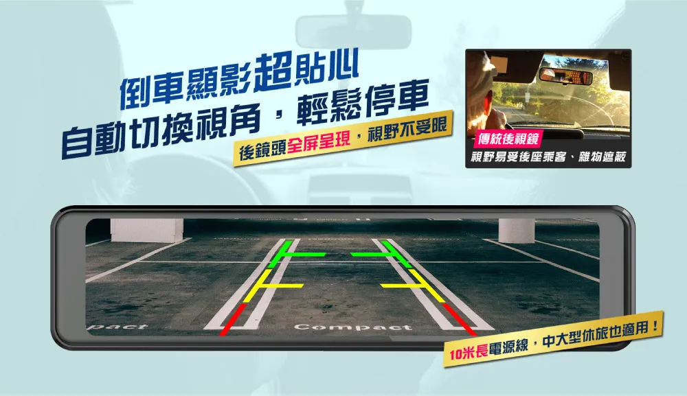 倒車顯影超貼心自動切換視角輕鬆停車後鏡頭全屏呈現,視野不受限-傳統後視鏡視野易受後座乘客、雜物遮蔽10米長電源線,中大型休旅也適用!