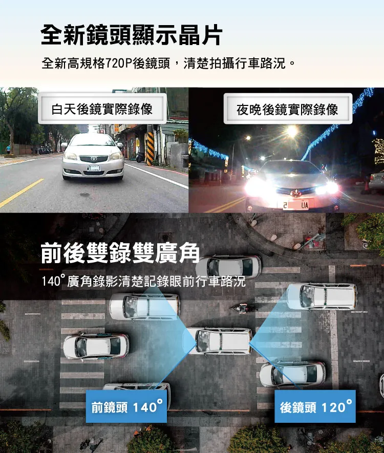 全新鏡頭顯示晶片全新高規格70P後鏡頭,清楚拍攝行車路況。白天後鏡實際錄像夜晚後鏡實際錄像前後雙錄雙廣角140°廣角錄影清楚記錄眼前行車路況2 UA前鏡頭 140°後鏡頭 120°